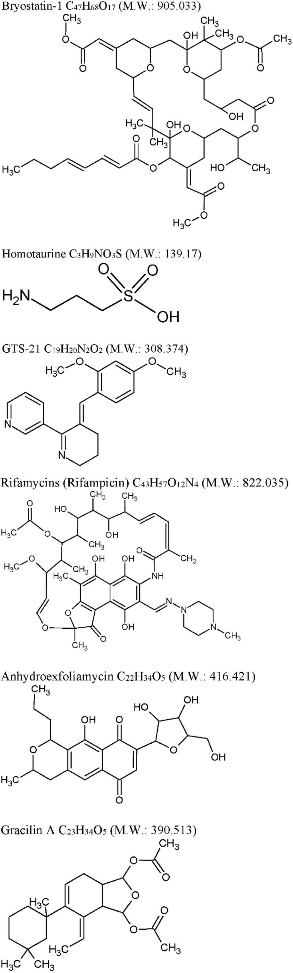 | Bryostatin-1: C47H68O17 M.W. 905.04 from Bugulaneritina (or brown bryozoans). | ||||