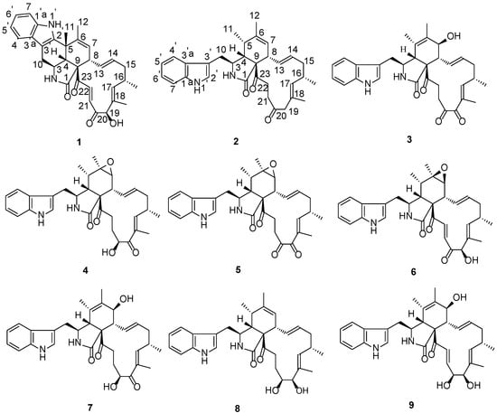 Chaetoglobosins are one class belonging to the cytochalasan alkaloids, containing a 10-(indol-3-yl) group and a tricyclic core in which a macrocyclic ring is commonly fused to a perhydroisoindolone moiety [,,,]. To date, about 80 chaetoglobosins have been found from some fungi belonging to the genera Chaetomium [,,], Discosia [], Cylindrocladium [], Penicillium [,], Calonectria [], Diplodia [], and Phomopsis [], most belonging to the genus Chaetomium. Many of them have been reported to possess diverse bioactivities, including cytotoxicity to tumor cell lines [,], anti-HIV [], antimicrobial [], phytotoxic activity [], and so on. Endophytes are fungi or bacteria that live in the healthy tissues of living plants without causing discernible disease to the host []. Among them, marine mangrove endophytic fungi have attracted significant attention for their notable ability to produce metabolites with novel structures and biological activities [,].