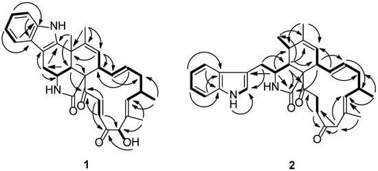 Key heteronuclear multiple bond correlation (HMBC, arrows) and chemical-shift correlation spectroscopy (COSY, bold lines) correlations of compounds 1 and 2.