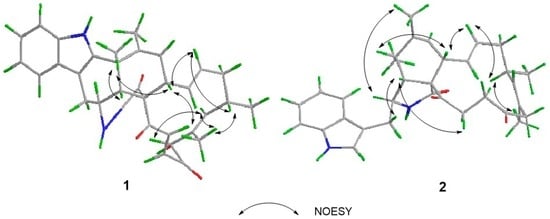 Key nuclear overhauser effect spectroscopy (NOESY) correlations of compounds 1 and 2.
