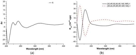 (a) Experimental circular dichroism (CD) of 1, and (b) calculated electronic CD (ECD) of 1 in MeOH.