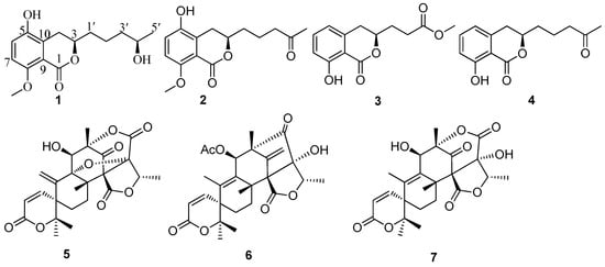 The fungal cultures were filtered through cheesecloth, and the filtrate was extracted with EtOAc (3 × 20 L, 24 h each). The organic extracts were concentrated in vacuo to yield an oily residue (10.2 g), which was subjected to silica gel column chromatography (CC) (petroleum ether, EtOAc v/v, gradient 100:0–0:100) to generate six fractions (Fr. 1–Fr. 5). Fr. 3 was isolated by CC on silica gel eluted with petroleum ether–EtOAc (v/v, gradient 100:10–10:100), and then subjected to Sephadex LH-20 CC eluting with mixtures of Petroleum ether:CHCl3:MeOH (2:1:1), and further purified by using HPLC on an ODS semi-preparative column (Agilent C18, 9.4 × 250 mm, 7 μm, 2 mL/min) eluted with 80% MeOH/H2O to obtain compound 1 (5.0 mg). Fr. 4 was isolated by CC on silica gel eluted with petroleum ether–EtOAc (v/v, gradient 100:10–10:100), and then subjected to Sephadex LH-20 CC eluting with mixtures of CHCl3–MeOH (1:1) to obtain Fr. 4.2 (400.0 mg), Fr. 4.3 (106.0 mg). Fr. 4.2 was subjected to repeated Sephadex LH-20 CC (CHCl3/MeOH, v/v, 1:1) and further purified by using HPLC on an ODS semi-preparative column (Agilent C18, 9.4 × 250 mm, 7 μm, 2 mL/min) eluted with 70% MeOH/H2O to obtain compounds 4 (6.0 mg) 5 (8.0 mg), 6 (10.0 mg), and 7 (7.0 mg). Fr. 4.3 was subjected to repeated Sephadex LH-20 CC (MeOH) and further purified by using HPLC on an ODS semi-preparative column (Agilent C18, 9.4 × 250 mm, 7 μm, 2 mL/min) eluted with 60% MeOH/H2O to obtain compounds 2 (5.0 mg) and 3 (6.2 mg).