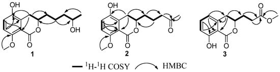 1H–1H COSY correlations and key HMBC correlations of Compounds 1–3.