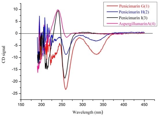 Compound 2 was isolated as colorless crystals with the molecular formula assigned as C15H18O5 (seven degrees of unsaturation) on the basis of its HR-ESI–MS and combined with 1H and 13C NMR spectroscopic data. The 1D NMR data of 2 was very similar with that of 1, except for the presence of a carbonyl signal (δC 211.4) for C-4′ in 2 and the absence of one oxygenated methine proton signal (δC 68.3) for C-4′ in 1. This was corroborated by the HMBC correlations from H-3′ and H-5′ to C-4′ (Figure 2). The 1H–1H-COSY, HMQC, and HMBC spectra allowed the complete assignment for 1. Thus, compound 2 was named as penicimarin H, and the absolute configuration of C-3 was also determined to be R by CD spectra (Figure 4) [18].