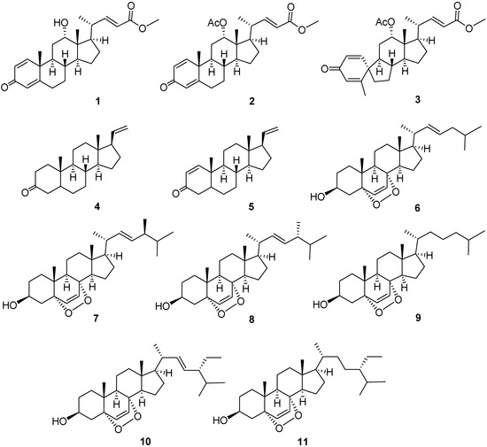 Marine organisms, including octocorals (Coelenterata: Anthozoa), have been shown to be a rich source of a variety of polyoxygenated steroids [1,2,3,4,5,6,7,8,9,10,11,12,13,14]. Some of these metabolites possess important bioactivities, such as cytotoxic [1,3,5,6,9,11,12,13,14], anti-inflammatory [3,6,8,11,13,14], antiviral [3,4], and antibacterial activities [3,7,10]. In order to discover medicinally useful natural compounds, we investigated the chemical constituents of a soft coral Umbellulifera petasites, which was chemically examined for the first time. The study led to the isolation of two new steroids, petasiterones A and B (1 and 2), and a novel spirosteroid, petasitosterone C (3), along with eight known steroids, 5α-pregna-20-en-3-one (4) [15], 5α-pregna-1,20-dien-3-one (5) [15], 5α,8α-epidioxycholesta-6,22-dien-3β-ol (6) [16], 25α,8α-epidioxy-24(S)-methylcholesta-6,22-dien-3β-ol (7) [16], 5α,8α-epidioxy-24(R)-methylcholesta-6,22-dien-3β-ol (8) [16], 5α,8α-epidioxycholest-6-en-3β-ol (9) [16], 5α,8α-epidioxy-24α-ethylcholesta-6,22-dien-3β-ol (10) [16], and 5α,8α-epidioxy-24α-ethylcholesta-6-en-3β-ol (11) [16] (Figure 1). The structures of the new metabolites were determined on the basis of extensive spectroscopic analysis (Supplementary Materials, Figures S1–S9), including HRESIMS and 1D and 2D NMR (COSY, HMQC, HMBC, and NOESY) spectroscopy. With the aim of discovering the bioactivities of the isolated natural products, the anti-inflammatory activity including nitric oxide (NO) inhibition activity of compounds 1–11 was evaluated by assay of LPS-stimulated NO production in activated RAW264.7 cells. The ability of suppressing superoxide anion generation and elastase release in N-formyl-methionyl-leucyl-phenylalanine/cytochalasin B (fMLP/CB)-induced human neutrophils were also studied. Furthermore, the cytotoxicities of compounds 1–11 against the cancer cell lines human erythroleukemia (K-562), lymphoid T carcinoma (MOLT-4), and human colorectal adenocarcinoma (DLD-1) were assayed. We report herein the isolation, structure elucidation, and biological activities of these marine natural products.