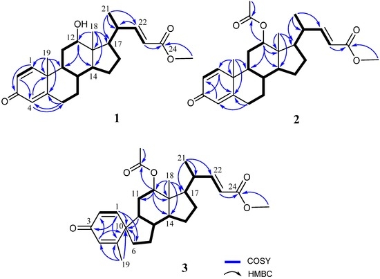 The frozen bodies of Umbellulifera petasites were sliced and extracted with ethyl acetate (EtOAc). The EtOAc extracts were evaporated and the residue was repeatedly chromatographed over silica gel and RP-HPLC to afford three new steroids, along with eight known steroids (4–11). Petasitosterone A (1), obtained as an amorphous solid, was found to possess a molecular formula C25H34O4 as established by HRESIMS (m/z 421.2350, [M + Na]+), appropriated for nine degrees of unsaturation. The IR spectrum revealed the presence of hydroxy (3445 cm−1), and carbonyl (1715 and 1663 cm−1) groups. The 1H NMR spectral data (Table 1) of 1 showed the presence of five olefinic methine protons (δH 6.98, dd, J = 15.6, 10.0 Hz; 6.97, d, J = 10.4 Hz; 6.21, dd, J = 10.4, 2.0 Hz; 6.06, s; 5.83, d, J = 15.6 Hz), and one oxymethine proton (δH 3.74, br s). The 13C NMR data (Table 1) and DEPT spectra indicated the presence of 25 carbons, including four methyl groups (containing a methoxy carbon), five methylenes, 11 methines, and five quaternary carbons (including two carbonyl groups). The carbon resonances at δC 186.4 (C), 155.4 (CH), 127.7 (CH), 123.9 (CH), and 169.0 (C) as well as the proton resonances at δH 6.97 (1H, d, J = 10.4 Hz), 6.21 (1H, dd, J = 10.4, 2.0 Hz), and 6.06 (1H, s) were characteristic signals of steroids with a 1,4-dien-3-one moiety in ring A [9]. Careful analysis of the COSY and HMBC spectra (Figure 2) allowed us to determine the molecular skeleton of 1. H-12 (δH 3.74, br s) showed HMBC correlations to C-9 and C-14, and H3-18 (δH 0.72, s) exhibited HMBC correlations to C-12, C-13, C-14, and C-17; revealing the position of a hydroxyl at C-12. As C-24 resonated at δC 167.4, and protons of the methoxyl (δH 3.74) gave HMBC correlation to this carbonyl carbon, thus the position of the methoxy group at C-24 carbonyl carbon was confirmed. On the basis of the molecular framework, the gross structure of 1 was established (Figure 2).
