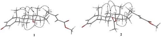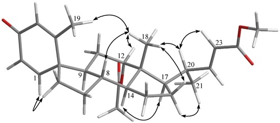 The relative configuration of 1 was established by the NOE correlations observed in a NOESY experiment. H-8 was found to show NOE correlations with both H3-18 and H3-19, and H3-18 exhibited correlations with one of the methylene protons at C-11 (δH 1.87, m), H-12, and H-20; therefore, due to the β-orientation of H3-18, all of H-8, H-12, H3-19, and H-20 should also be positioned on the β-face. Furthermore, NOE responses between H-11α (δH 1.75, m) and H-9, H-9 and H-14, and H-14 and H-17, were observed on the α-orientation of H-9, H-14 and H-17 (Figure 3).