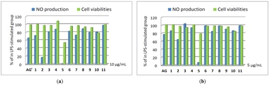 Nitric oxide (NO) production and cell viabilities of compounds 1–11 in LPS-stimulated RAW264.7 cells (a) at 10 μg/mL (b) at 5 μg/mL. a AG: aminoguanidine used as a positive control.