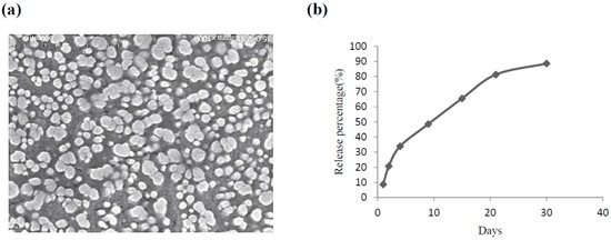 Characteristics of vascular endothelial growth factor (VEGF)-chitosan (CS) nanoparticles. (a) Representative shapes of VEGF-CS nanoparticles via scanning electron microscope (SEM) technology; (b) Release percentage of VEGF-chitosan nanoparticles in vitro.