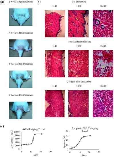 Apoptosis of vascular endothelial cells and changes of von Willebrand factor (vWF), which closely resembled those of vascular disease, were a sensitive index of vascular endothelial cell injury [18,19,20]. Figure 2c shows that the contents of vWF and the number of apoptotic cells increased after 1 week of irradiation and nearly reached a peak after 2 weeks, then remained stable, with significantly higher values than those of the non-irradiated group (p < 0.05).