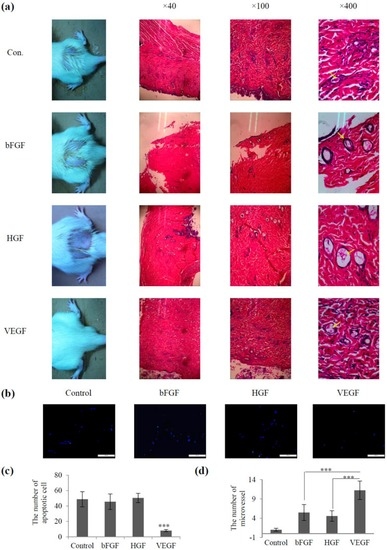 The same amounts of growth factors such as basic fibroblast growth factor (bFGF), hepatocyte growth factor (HGF), and VEGF were used for radiation-induced skin injury treatment. Figure 3a shows that after 2 weeks of treatment, all rats displayed hair loss in the control group, which was treated with equal volumes of normal saline. The bFGF- and HGF-treated groups showed slight hair loss, while the VEGF-treated group had no significant hair loss. Furthermore, the development of hair loss and ulcers was delayed in the VEGF group compared with that in the other groups. Morphological studies showed that the VEGF-treated group showed a nearly normal strata structure, complete re-epithelialization, and few hair follicles, whereas the other groups showed thickening of the epidermal layer and poorly vascularized granulation tissue. In addition, the number of apoptotic cells was lower in the VEGF-treated group than in the other groups (Figure 3b,c). The number of microvessels was higher in the VEGF group than in the other groups, and the difference was statistically significant (p < 0.05) (Figure 3d). Taken together, these data suggested that the rats injected with VEGF had better results than the other groups. This observation coincides with the results of other research groups, who used EVGF165 for the treatment of wounds in diabetic mice [21].