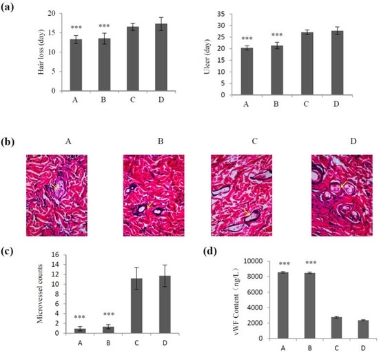 Effect of CS-VEGF nanoparticles on healing of irradiation-induced skin injury. The 64 rats bearing irradiation-induced skin injury were divided into four groups (A–D): A, single treatment with 1 mL normal saline as control; B, single treatment with 1 mL VEGF165 (700 ng/mL); C, treatment with 1 mL VEGF165 (100 ng/mL) daily for 1 week; and D, single treatment with 1 mL heavy suspension of VEGF165-CS nanoparticles. (a) Hair loss and ulcer development in each group after irradiation; (b) Hematoxylin and eosin staining (×100) of skin tissues; (c) Number of microvessels; (d) vWF content in each group. *** p < 0.005 (c–d). Arrows pointing to vessels.