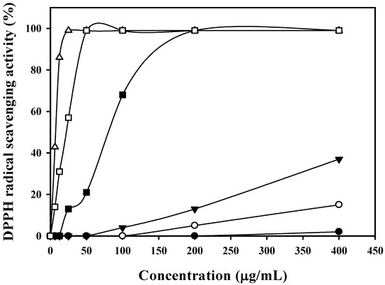 DPPH radical scavenging activities of 4-1 to 4-5. —●—, 4-1; —○—, 4-2; —▼—, 4-3; —△—, 4-4; —■—, 4-5; and —□—, α-tocopherol.