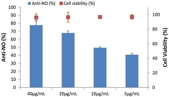 NO inhibitory activities of HGA isolated from culture supernatant of Paenibacillus sp. TKU036 in the SPP-containing medium. Cell lines: Murine RAW 264.7 monocyte/macrophage cells. The cells were treated with LPS (1 μg/mL) or in combination with the tested agents (40, 20, 10, and 5 μg/mL) for 24 h.