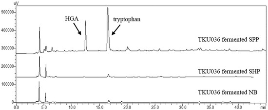 2.7. Confirmation of HGA and Tryptophan Produced from SPP by Fermentation
