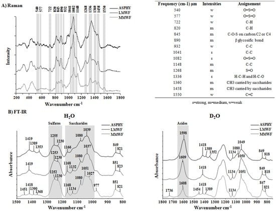 Raman and Fourrier Tansform Infrared (FT-IR) Spectroscopy analysis. Fucoidan spectra are represented in black for crude Ascophyscient (ASPHY), dark grey for the low molecular weight fucoidan (LMWF) and light grey for the medium molecular weight fucoidan (MMWF) for (A) Raman and (B) FT-IR (in H2O and in D2O). The numbers indicates the characteristics bands for polysaccharides.