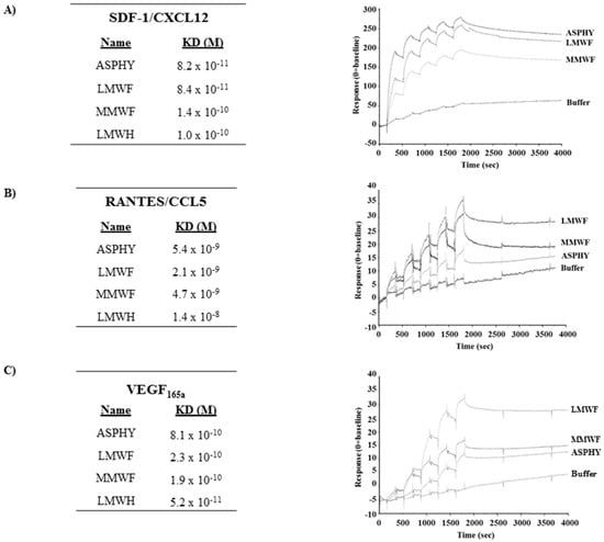 There were no significant differences between the affinities of all fucoidans towards SDF-1/CXCL12 and RANTES/CCL5 and the affinities of LMWH (1.0 × 10−10 M, 1.4 × 10−8 M and 5.2 × 10−11 M respectively).
