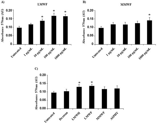 Effect of fucoidans on cell viability. The viability of HUVECs was analyzed by using MTT assay after fucoidan treatment for 24 h. The absorbance was read with a spectrophotometer (at 570 nm). HUVECs were incubated with (A) LMWF and (B) MMWF at increasing concentration (1, 10, 100, and 1000 μg/mL); (C) HUVECs were incubated 24 h with polysaccharides (dextran, LMWH, LMWF, MMWF and ASPHY) at 10 μg/mL. Values are expressed as means ± SEM (n ≥ 3). AU-Arbitrary units. * p < 0.05 versus Untreated.