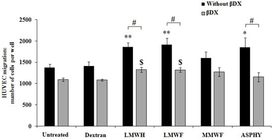 Pro-migratory potential of fucoidans on GAG-free HUVECs. HUVECs were seeded and incubated 24 h in the upper chamber with the polysaccharides dextran, LMWH, LMWF, MMWF or ASPHY at 10 μg/mL. The basal migration was performed in complete medium with 12% FBS. In the aim to remove the GAGs, the cells were pre-treated with βDX for 48 h, then the migration assay was performed with the same treatments as described above. The cells were fixed, stained with Mayer’s hemalun solution and counted after migration. Values are expressed as cell number per well. * p < 0.05 ASPHY versus Untreated (all without βDX); ** p < 0.01 LMWH and LMWF versus Untreated (all without βDX); $ p < 0.05 LMWH and LMWF versus Untreated (all with βDX); # p < 0.05 LMWH and LMWF and ASPHY (all without βDX) versus LMWH and LMWF and ASPHY (all with βDX).