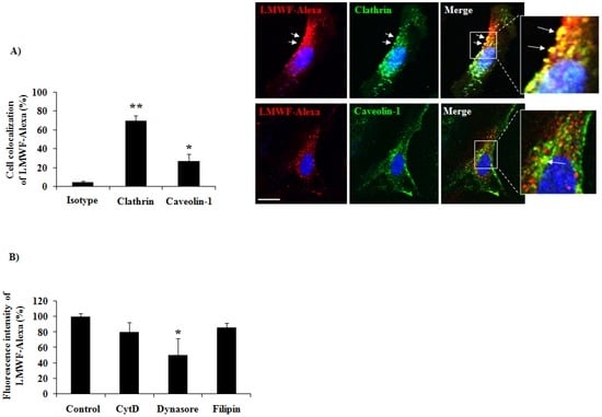 In this last part of our work we analyzed the mechanism of LMWF-Alexa endocytosis at 2 h of incubation using two specific markers of the receptor-dependent and receptor-independent endocytic pathways, clathrin and caveolin-1, respectively. We realized a co-localization assay of LMWF-Alexa (red fluorescence) with clathrin or caveolin-1 (green fluorescence) using confocal microscopy. A merge of the green and red fluorescent pictures were performed to see the co-localization of LMWF-Alexa with clathrin or caveolin-1. The fluorescence intensity per cell was quantified and the co-localization level was measured by scoring the proportion of red spots on green spots. The results showed that LMWF-Alexa was co-localized with clathrin at 70% ± 6% (Figure 7A, upper panel, arrows in the merge), but less co-localization was observed with caveolin-1 at 27% ± 7% (Figure 7A, lower panel, merge). This result suggested that LMWF-Alexa was mainly internalized by HUVECs in a clathrin-mediated endocytosis at 2 h of incubation.