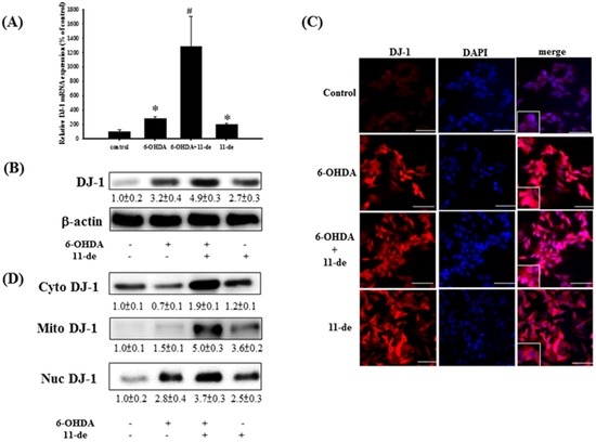 We examined the effect of 11-de on the expression of DJ-1. Pretreatment with 11-de (10 nM) for 1 h significantly enhanced the 6-OHDA-induced upregulation of DJ-1 mRNA and protein expression (Figure 1A,B, respectively). Double immunofluorescence staining (DJ-1 in red; the nucleus in blue) revealed that 6-OHDA, 6-OHDA + 11-de, or 11-de alone significantly upregulated DJ-1 protein expression in the cytosol and the nucleus compared to the control (Figure 1C). We further examined DJ-1 protein expression in the cytosol, nucleus, and mitochondria using western blotting. We found that 11-de enhanced 6-OHDA-induced upregulation of DJ-1 protein expression in the cytosol and nucleus. Notably, compared with the control, DJ-1 was upregulated in the mitochondria of 6-OHDA + 11-de and 11-de only treatment groups, but not the 6-OHDA treatment group.