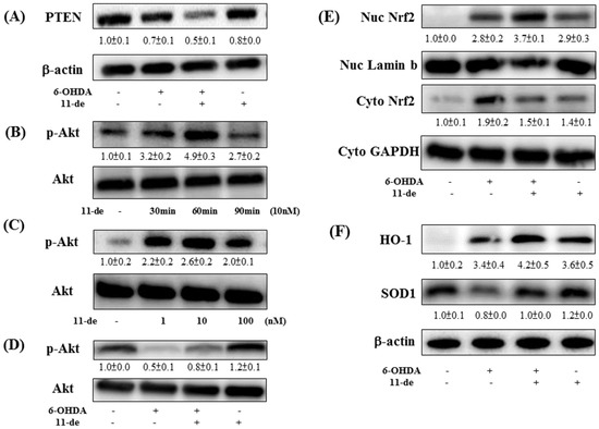 Pretreatment of SH-SY5Y cells with 10 nM 11-de for 1 h further downregulated 6-OHDA-induced downregulation of PTEN expression (Figure 2A). In addition, pretreatment with 11-de increased the expression of p-Akt at 30 min and 60 min, and p-Akt returned to baseline at 90 min (Figure 2B). Moreover, at concentrations ranging from 1 to 100 nM, 11-de pretreatment upregulated p-Akt expression at 60 min (Figure 2C). Pretreatment with 11-de (10 nM) significantly attenuated the 6-OHDA-induced downregulation of p-Akt expression (Figure 2D). Pretreatment with 11-de significantly enhanced 6-OHDA-induced upregulation of nuclear (Nuc) Nrf2 expression (Figure 2E). The downstream products in the Nrf2 pathway are SOD1 and HO-1. Our data show that 11-de significantly enhanced 6-OHDA-induced upregulation of HO-1, and attenuated the 6-OHDA-induced-downregulation of SOD-1 expression (Figure 2F). Moreover, pretreatment with 11-de alone significantly induced SOD-1 protein expression.