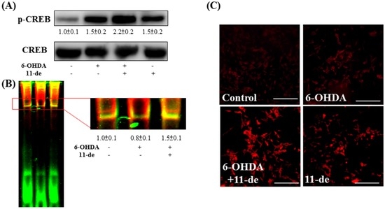 We confirmed the effects of 11-de on p-CREB expression and the binding affinity of the CRE domain. Our result demonstrated that pretreatment with 11-de enhanced 6-OHDA-induced upregulation of p-CREB expression (Figure 3A). Moreover, 11-de significantly attenuated the 6-OHDA-induced downregulation of CBP binding affinity with the CRE domain, based on an electrophoretic mobility shift assay (EMSA) analysis (Figure 3B). We detected one of the downstream products of the CRE domain, namely, BDNF (Figure 3C). Pretreatment with 11-de upregulated the expression of BDNF in both the presence and absence of 6-OHDA. However, pretreatment with 6-OHDA alone did not alter BDNF expression.