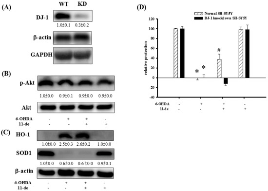 At 24 h post-siRNA transfection, DJ-1 expression levels were reduced to 34.4% (Figure 4A). There were no observable changes in p-Akt expression in 6-OHDA, 6-OHDA + 11-de, and 11-de only treatment groups in DJ-1-knockdown cells (Figure 4B). In addition, in DJ-1-knockdown cells, 11-de did not affect the 6-OHDA-induced upregulation of HO-1, or the downregulation of SOD-1 expression (Figure 4C). The relative protection percentage of the control, 6-OHDA-treated, 6-OHDA + 11-de (10 nM)-treated, and 11-de (10 nM)-treated groups in normal SH-SY5Y were 100% ± 0.9%, 0% ± 4.1%, 37.4% ± 10.7%, and 98.2% ± 5.7%, respectively. In DJ-1-knockdown SH-SY5Y cells, the relative protection percentage of the control, 6-OHDA-, 6-OHDA + 11-de-, and 11-de-only- treated groups were 100% ± 4.8%, 0% ± 6.4%, −11.9% ± 3.8%, and 98.5% ± 9.1%, respectively (Figure 4D). DJ-1-knockdown completely inhibited the protective effects of 11-de in 6-OHDA-treated SH-SY5Y cells.
