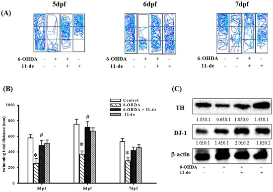 Effects of 11-de on 6-OHDA-induced locomotor deficit, downregulation of TH expression, and upregulation of DJ-1 expression. Zebrafish were treated with 0.1 μM 11-de (from 9 hpf (hour post fertilization) to 4 dpf) and with 250 μM 6-OHDA (from 2 to 4 dpf). (A) Typical swimming pattern at 5, 6, and 7 dpf in the control, 6-OHDA-treated, 6-OHDA plus 11-de-treated, and 11-de-treated groups (n = 16); (B) Total swimming distance at 5, 6, and 7 dpf for the control, 6-OHDA-treated, and 6-OHDA plus 11-de-treated groups (n = 16). Data shows that 11-de significantly reverses the 6-OHDA-induced deficiency of locomotor activity in 5, 6 dpf. Then, we detected the TH and DJ-1 expression. Zebrafish were treated with 0.1 μM 11-de (from 9 hpf to 4 dpf) and with 250 μM 6-OHDA (from 2 to 4 dpf); (C) Western blot analysis for TH and DJ-1 expression at 5 dpf in the control, 6-OHDA-treated, 6-OHDA plus 11-de-treated, and 11-de-treated groups (n = 3; twenty fish for each band). Our data shows that 11-de significantly reverses the decrease in expression of TH, a biomarker of dopaminergic neurons. Data shows that 11-de significantly increases the 6-OHDA-induced upregulation of DJ-1 expression. Each sample contained 20 zebrafish heads. Each value represents the mean of three samples, and error bars represent mean ± SEM. *, significantly different from the control group; #, significantly different from the 6-OHDA group (p < 0.05).