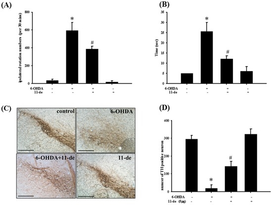 Treatment with 11-de protects against a methamphetamine-induced increase in the number of turns in rotation behavior, and an increase in time spent on the beam in the narrow beam test, and an increase in TH expression in 6-OHDA-induced rat model of PD. Rats were treated with 20 μg/kg 11-de (concentration 0.5 μg/μL for 10 μL) and 5 μg 6-OHDA plus 11-de. (A) Number of rotations analysis for rats at 14 days after lesion-induction in the sham, 6-OHDA-treated, 6-OHDA plus 11-de-treated, and 11-de-treated groups; (B) time spent on narrow beam for rats at 14 days after lesion in the sham, 6-OHDA-treated, 6-OHDA plus 11-de-treated, and 11-de-treated groups. Our data shows that 11-de significantly reverses the increase in number of turns in rotation behavior and reduces time spent on the beam in the narrow beam test. We also detected TH expression in the substantia nigra of 6-OHDA-induced rat models of PD. Rats were treated with 20 μg/kg 11-de (concentration 0.5 μg/μL for 10 μL) and 5 μg 6-OHDA plus 11-de. Whole-mount immunohistochemistry for TH expression at 14 days after lesions in (C) sham, 6-OHDA-treated, 6-OHDA plus 11-de-treated, and 11-de-treated groups; (D) quantitative results of TH-positive cells. Each bar was quantified by six samples. Our results demonstrated that 11-de significantly reverses 6-OHDA-induced downregulation of TH, which is a biomarker of dopaminergic neurons. Each value represents the mean of six samples, and error bars represent mean ± SEM. *, significantly different from the control group; #, significantly different from the 6-OHDA group (p < 0.05).