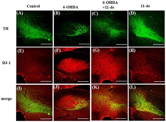Effect of 11-dehydrosinulariolide on DJ-1 expression in a 6-OHDA-induced rat model of PD. Rats were treated with 5 μg/kg 11-dehydrosinulariolide (concentration 0.5 μg/μL for 10 μL), 20 μg 6-OHDA plus 11-dehydrosinulariolide and 11-dehydrosinulariolide alone for 14 days. The immunofluorescence staining of TH (green) (A–D) and DJ-1 (red) (E–H) in rat brains after 6-OHDA administration and 11-dehydrosinulariolide treatment, showing brains from the control (I); 6-OHDA-treated (J); 6-OHDA plus 11-dehydrosinulariolide-treated groups (K); and 11-dehydrosinulariolide alone (L) (n = 3). Treatment with 11-dehydrosinulariolide significantly increases expression of DJ-1 colocalized with TH, which is induced by 6-OHDA administration (scale bar = 100 μm).