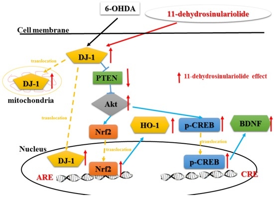 Putative therapeutic mechanisms of action of 11-de in 6-OHDA-induced cell death. 6-OHDA increases the upregulation of DJ-1 protein expression and translocates from the cytosol into the nucleus and mitochondria. The cytosolic DJ-1 inhibits downstream signaling via PTEN. The 6-OHDA-induced downregulation of PTEN activates the Akt pathway and its downstream Nrf2 and p-CREB pathways. Activation of Akt induces Nrf2 translocation into the nucleus, and results in the upregulation of HO-1, but not SOD-1. Moreover, 6-OHDA increases the translocation of p-CREB into nucleus and the upregulation of BDNF expression. The compound 11-de not only significantly enhanced 6-OHDA-induced upregulation of cytosolic DJ-1 expression but also promoted DJ-1 translocation into mitochondria and the nucleus. In contrast, 11-de activates Akt and induces the upregulation of Nrf2 and p-CREB. The 11-de-induced upregulation of DJ-1 inhibits downstream PTEN and attenuates the 6-OHDA-induced downregulation of Akt. The translocation of Nrf2 into the nucleus leads to the upregulation of HO-1 and SOD-1 expression. In contrast, 11-de also increases the expression of p-CREB, and increases its binding affinity with the CRE domain. In addition, 11-de upregulates expression that is downstream of the p-CREB pathway, such as BDNF expression.