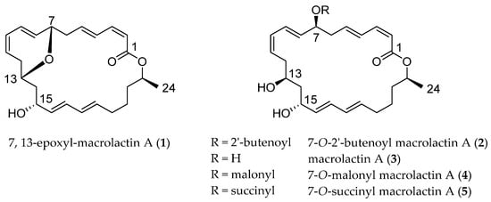 Macrolactins, an important 24-membered macrolactones, are mainly produced by Bacillus [19,20,21,22]. In our previous study [19], a new macrolactin (2) and three known ones (3–5), were isolated from Bacillus subtilis B5, a bacteria derived from the 3000-meter deep-sea sediment of the Pacific Ocean. 7-O-2′E-Butenoyl macrolactin A (2) exhibited antifungal activity against tea pathogenic fungi Pestalotiopsis theae and Colletotrichum gloeosporioides. Continuous investigations on the chemical ingredients of B. subtilis B5 led to the isolation of another new macrolactin, 7,13-epoxyl-macrolactin A (1) (Figure 1). Studies on the anti-inflammatory activity of these macrolactins revealed that the new compound (1) exhibited potent activity, owing to the existence of an epoxy ring. The 3-(4,5-dimethylthiazol-2-yl)-5-(3-carboxymethoxyphenyl)-2-(4-sulfonyl)-2H-tetrazolium (MTS) assay demonstrated that these macrolactins did not exhibit obvious cytotoxic effect at the employed concentrations (1–40 μM) on RAW 264.7 cells. Compound 1 significantly inhibited the mRNA expressions of iNOS, IL-1β, and IL-6, while other known macrolactins showed fewer inhibitory effects in LPS-stimulated RAW 264.7 macrophages. Additionally, reverse transcription-PCR analysis demonstrated that the new compound inhibited the mRNA expression level of IL-1β in a concentration-dependent manner.