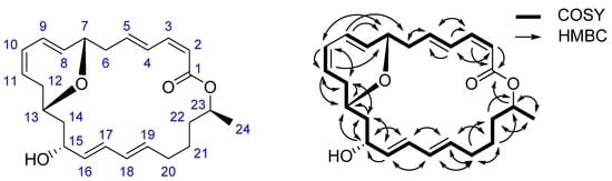 - Mondol, M.A.M.; Tareq, F.S.; Kim, J.H.; Lee, M.A.; Lee, H.-S.; Lee, Y.-J.; Lee, J.S.; Shin, H.J. Cyclic ether-containing macrolactins, antimicrobial 24-membered isomeric macrolactones from a marine Bacillus sp. J. Nat. Prod. 2011, 74, 2582–2587. [Google Scholar] [CrossRef] [PubMed]