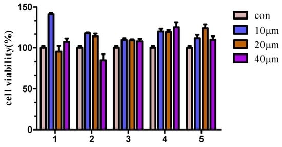 Cytotoxicity of compounds 1–5 in RAW 264.7 cells were tested by using the MTS assay. The result showed that compounds 1–5 did not exhibit obvious cytotoxic effect at the employed concentrations (10–40 μM) (Figure 3). Interestingly, Compound 1 can promote cell proliferation under the low concentration 10 μM. This may be because, in this case, it activates the cell survival. The detailed mechanism still needs further research.