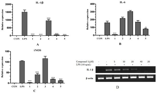 Effects of compounds 1–5 on the mRNA expression of LPS-induced interleukin-1β (IL-1β) (A), interleukin-6 (IL-6) (B) and nitric oxide synthase (iNOS) (C) of RAW 264.7 cells at the concentration of 40 μM by Real-Time Polymerase Chain Reaction Analysis. (D) Effects of 1 on IL-1β mRNA expressions at concentrations of 5–40 μM by Reverse Transcription-Polymerase Chain Reaction Analysis. The β-actin was used as a loading control. The cells in a six-well were pretreated with compounds for 1.5 h and then stimulated with LPS (100 ng/mL) for another 12 h. LPS-induced mRNA expression of iNOS and IL-6 was reduced by 96.6% and 93.8%, respectively, when cells were cotreated with compound 1. Total RNAs were isolated from cells and analyzed. The p values were assessed by Student’s t test. A p value less than 0.05 was considered statistically significant (* p < 0.05; *** p < 0.001). (Data represent the mean ± SD of different experiments.