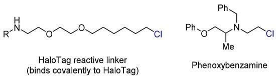The reactive nature of primary alkyl chlorides is sometimes exploited in medicinal chemistry and chemical biology. HaloTag is a modified haloalkane dehalogenase that is used to covalently bind to a synthetic ligand of choice and fuse to a protein of interest (Figure 1) []. This construct allows for a variety of experiments including protein purification, protein stability studies and protein translocation assays. This technology relies on the use of an alkyl chloride linker that rapidly (typically within minutes) forms a covalent bond with the protein tag under physiological conditions. Phenoxybenzamine, an irreversible α-blocker, forms covalent bonds with adrenergic receptors through the attack of a cysteine residue at the alkyl chloride moiety in transmembrane helix 3 (Figure 1) [].