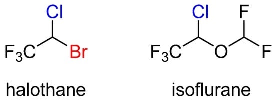 General anesthetics are agents that can cause reversible loss of consciousness. They have been used in medicine since the mid-1800s [], however their mechanism of action remains a topic of debate. For decades, the general view was that anesthetics act by nonspecific perturbation of lipid membranes. This hypothesis has more recently been disproven as a result of a number of findings. Most importantly, stereospecific effects have been observed for general anesthetic binding. Two chiral alkyl halide anesthetics, isoflurane and halothane, are on the WHO’s list of essential medicines (Figure 2) [].