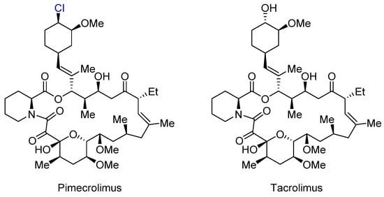 Pimecrolimus and tacrolimus are immunosuppressants used for the topical treatment of atopic dermatitis (eczema). They both bind to the protein macrophilin-12 and inhibit the phosphatase calcineurin, resulting in the blockage of T cell activation (Figure 7) [].