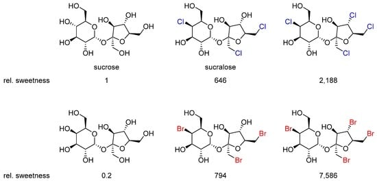 Generally, highly intense sweeteners tend to be more hydrophobic, which is suggested to give rise to stronger absorption to taste bud tissue in contrast to simple sugars, which are more hydrophilic, less sweet and weakly absorbed to the taste buds. This trend can be clearly observed in the series of synthetic halogenated analogs of sucrose (Figure 8) [].