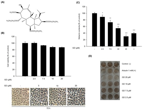 Effects of GD on melanogenesis in melan-a cells. (A) The chemical structure of GD; (B) Cell viability was determined by MTT assay with the indicated concentrations of GD for 72 h, and the cellular morphology was observed under a phase-contrast microscope (at 100× magnification); (C) Inhibition of melanin biosynthesis in melan-a cells treated with the indicated concentrations of GD for 72 h. Arbutin (1 mM) was used as a positive control; (D) Macroscopic views of the results of (C). Data are shown as the mean ± standard deviation. * P < 0.05, ** P < 0.01, *** P < 0.001 are considered statistically significant compared to the control group.