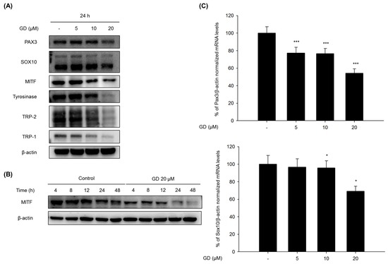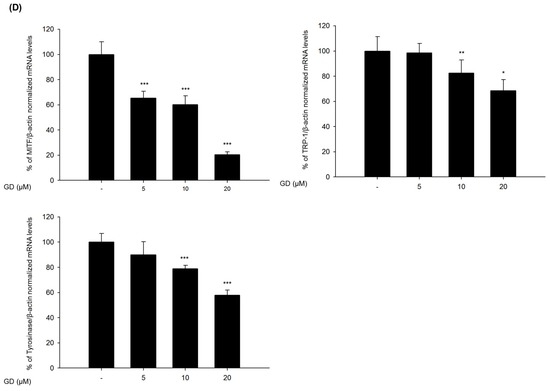 (A) Melan-a cells were treated with the indicated concentrations of GD for 24 h, and (B) melan-a cells were treated for the indicated times in the presence or absence of 20 μM GD; (C,D) Melan-a cells were treated at various concentrations of GD for 12 h, and the mRNA levels were examined by real-time RT-PCR. * P < 0.05, ** P < 0.01, *** P < 0.001 are considered statistically significant compared to the control group.