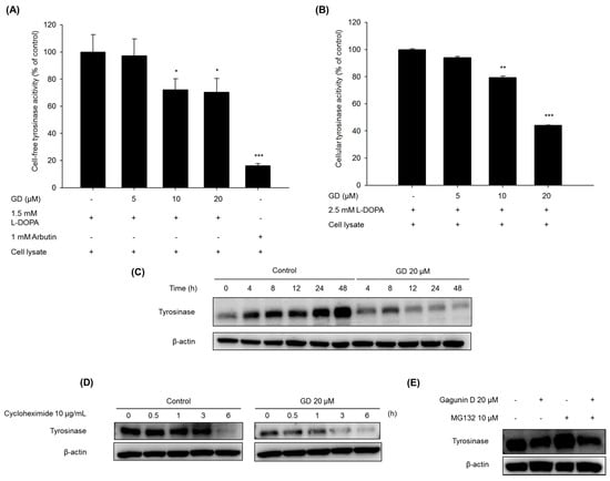 When the tyrosinase protein levels were monitored for up to 48 h, GD effectively downregulated the expression of tyrosinase protein in a time-dependent manner compared to the control cells (Figure 3C). To further analyze whether the effect of GD on the expression of tyrosinase proteins was associated with the proteolytic degradation of the proteins, the levels of tyrosinase expression were monitored for up to 6 h after pretreatment with cycloheximide, a protein synthesis inhibitor [19]. Treatment with GD accelerated the proteolytic degradation of tyrosinase compared to the control groups. Next, to examine the degradation pathway by GD, a 26s proteasome inhibitor MG132 was used for pretreatment, and the tyrosinase level was determined by Western blot. As shown in Figure 3E, tyrosinase degradation was abrogated by the proteasome inhibitor, a multicatalytic proteinase complex that selectively degrades intracellular ubiquitinated proteins [6,20]. Thus, GD accelerated the degradation of tyrosinase and inhibited tyrosinase enzymatic activity.