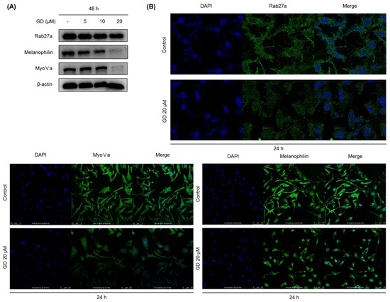 To further examine the effects of GD on melanosome transfer, the expression of melanosome transfer-associated proteins was determined by Western blot. As depicted in Figure 4A, GD effectively suppressed the expression of rab27a, melanophilin, and myosin Va, which are the main melanosome transfer-associated proteins, after treatment of GD for 48 h (Figure 4A). The downregulation of rab27a, melanophilin and myosin Va by GD was confirmed by immunocytochemical analysis (Figure 4B).