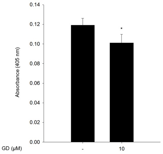 The inhibitory effect of GD on melanin biosynthesis in a reconstructed human skin model, Neoderm®-ME. The melanin content from the lysates was measured at 405 nm after dissolving the reconstructed human skins in 1 N NaOH. * P < 0.05 is considered statistically significant compared to the control group.