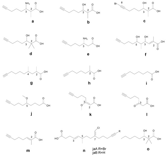 Structures of the terminal alkynyl fatty acyl moieties identified in cyclic/acyclic marine peptides. a. 3-amino-2-methyl-7-octynoicacid (Amoya); b. 3-hydroxy-2-methyloct-7-ynoic acid (Hmoya); c. bromine-containing 3-hydroxy-2-methyloct-7-ynoic acid (Br-Hmoya); d. 2,2-dimethyl-3-hydroxy-7-octynoic acid (Dhoya); e. 3-amino-6-octyneoic acid (Aoy); f. 5,7-dihydroxy-2,6-dimethyldodec-2-en-11-ynoic acid (Dddd); g. 2,4-dimethyl-9-decynoic acid; h. 2-methyl-7-octynoic acid (Moya); i. 7-octynoic acid (Oya); j. 5-methoxydec-9-ynoic acid (Mdyna); k. 3-methoxy-2-en-7-octynoic acid; l. 3-keto-7-octynoic acid; m. (E)-2-methyloct-2-en-7-ynoic acid; n. (4E,9E)-9-(chloromethylene)-6-methyltetradec-4-en-13-ynoic acid; o. 2,2-dimethyl-3-hydroxy-7-octanoic acid (Dhoaa).
