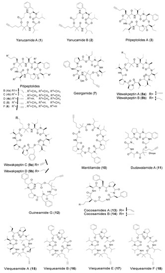 - Tan, L.T.; Sitachitta, N.; Gerwick, W.H. The guineamides, novel cyclic depsipeptides from a papua new guinea collection of the marine cyanobacterium Lyngbya majuscula. J. Nat. Prod. 2002, 66, 764–771. [Google Scholar] [CrossRef] [PubMed]