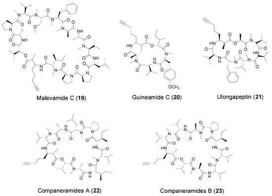 Malevamide C (19, Table 1, Figure 3), as the first reported 3-amino-2-methyl-7-octynoic acid (Amoya)-containing cyanobactrial peptide, was obtained from a cyanobactrium Symplocalaete-viridis collected in waters adjacent to AlaMoana Beach Park, Hawaii in 2000. The unusual β-amino acid residue, Amoya, was only previously identified in onchidin, a cyclic depsipeptide isolated from a marine mollusk Onchidium spp. [32]. However, malevamide C did not display potent cytotoxicity against a variety of cancer cell lines. In 2003, another Amoya-containing cyclic depsipeptide, guineamide C (20, Figure 3) was discovered by William Gerwick’s group from a Papua New Guinea collection of the marine cyanobacterium Lyngbya majuscula. As malevamide C, guineamide C, only exhibited moderate cytotoxicity against neuroblastoma cells with an IC50 value of 16 μM [33]. Meanwhile, Williams et al. reported discovery of ulongapeptin (21) featuring Amoya residue, isolated from a dark reddish-black clump of cyanobacterium, designated VP755 collected at Ulong Channel in Palau. Interestingly, ulongapeptin showed strong cytotoxicity against KB cells at an IC50 value of 0.63 μM [34]. Just recently, two new cyclic depsipeptides, companeramides A (22) and B (23) containing Amoya unit, were obtained from a marine cyanobacterial assemblage comprising a small filament Leptolyngbya species, from Coiba Island, Panama. It is interesting to note that companeramides A and B showed high nanomolar in vitro antiplasmodial activity, though not quite cytotoxic to human cancer cell lines [35].