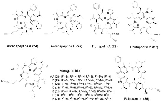 Palau’amide (35, Figure 4) is a unique terminal alkynyl-containing cyclic depsipeptide, consisting of a novel polyketide unit, 5,7-dihydroxy-2,6-dimethyldodec-2-en-11-ynoic acid (Dddd), which was obtained from a Lyngbya sp. from Palau. Palau’amide showed strong cytotoxicity against KB cells with an IC50 value of 13 nM [41].