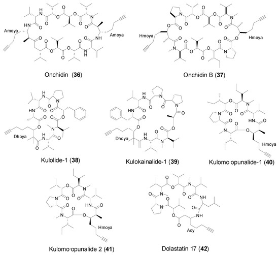 3-amino-6-octyneoic acid (Aoy, e) as an unprecedented terminal alkynyl moiety, was only identified in a novel cyclic depsipeptide, dolastatin 17, isolated from a sea hare Dolebella auricularia [12]. Dolastatin 17 (42, Figure 5) displayed significant growth-inhibitory activity against OVCAR-3 (GI50 0.67 μg/mL), SF-295 (GI50 0.55 μg/mL), NCI-H460 (GI50 0.74 μg/mL), KM20L (GI50 0.45 μg/mL) human cancer cell lines [42].